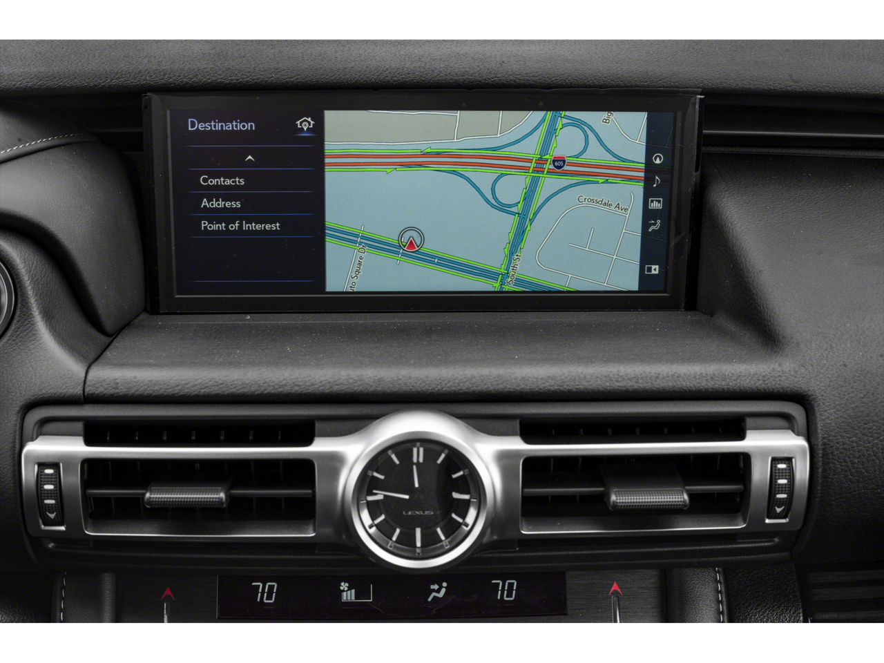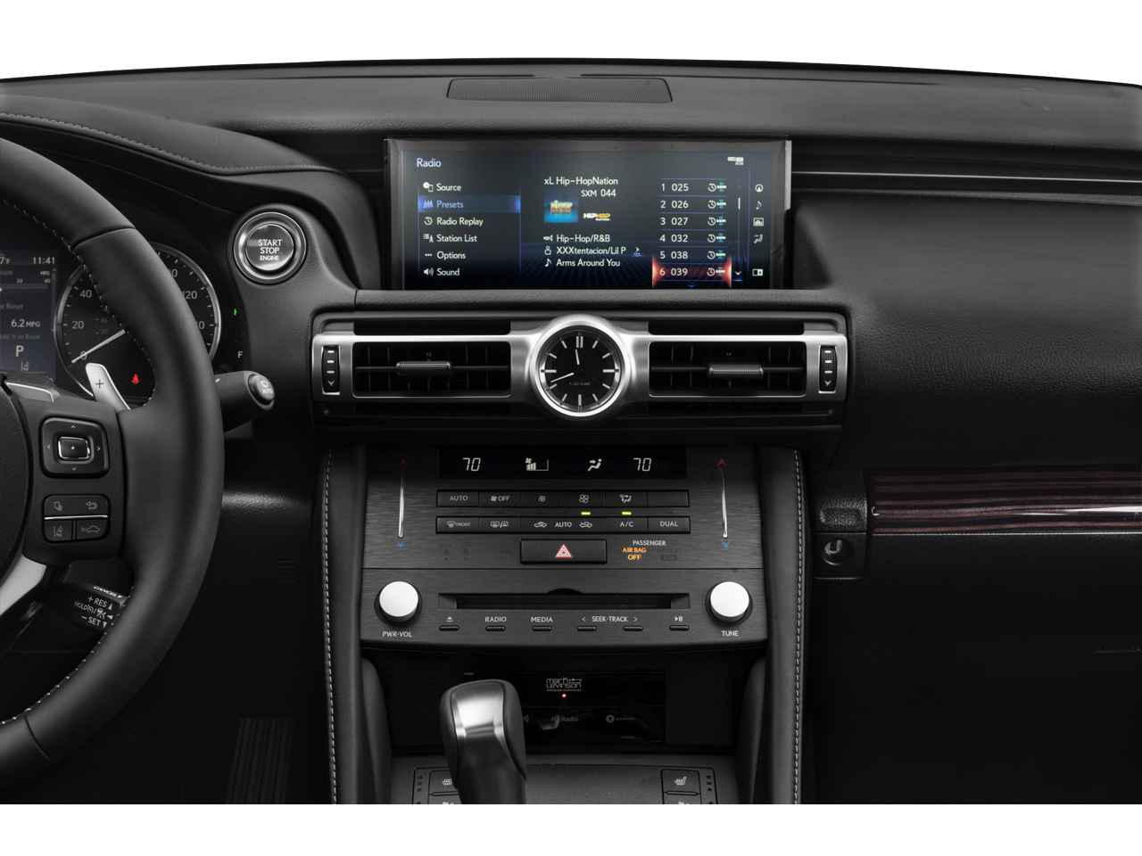 This vehicle comes equipped with: 10 Speakers, 4-Wheel Disc Brakes, ABS brakes, Air Conditioning, Alloy wheels, AM/FM radio: SiriusXM, Apple CarPlay/Android Auto, Auto High-beam Headlights, Auto-dimming Rear-View mirror, Automatic temperature control, Brake assist, Bumpers: body-color, CD player, Compass, Delay-off headlights, Driver door bin, Driver vanity mirror, Dual front impact airbags, Dual front side impact airbags, Electronic Stability Control, Emergency communication system: Enform Safety Connect (complimentary 3-year subscription), Exterior Parking Camera Rear, Four wheel independent suspension, Front anti-roll bar, Front Bucket Seats, Front Center Armrest, Front dual zone A/C, Front reading lights, Fully automatic headlights, Garage door transmitter: HomeLink, Genuine wood dashboard insert, Genuine wood door panel insert, Heated door mirrors, Illuminated entry, Knee airbag, Leather Shift Knob, Lexus Enform Wi-Fi, Low tire pressure warning, NuLuxe Seat Trim, Occupant sensing airbag, Outside temperature display, Overhead airbag, Overhead console, Panic alarm, Passenger door bin, Passenger vanity mirror, Power door mirrors, Power driver seat, Power Front Bucket Seats, Power passenger seat, Power steering, Power windows, Radio data system, Radio: AM/FM 1-Disc, Rear anti-roll bar, Rear reading lights, Rear window defroster, Remote keyless entry, Security system, Speed control, Speed-sensing steering, Speed-Sensitive Wipers, Split folding rear seat, Steering wheel mounted audio controls, Tachometer, Telescoping steering wheel, Tilt steering wheel, Traction control, Trip computer, Turn signal indicator mirrors, Variably intermittent wipers, and Wheels: 18 Split-5-Spoke Alloy.