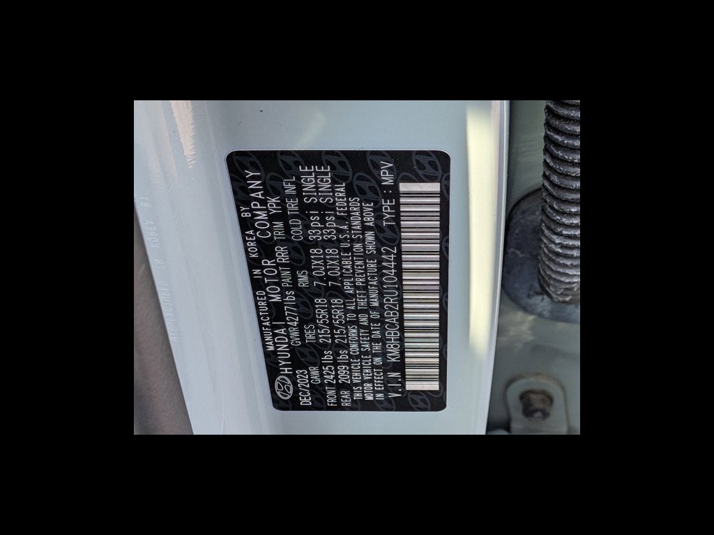 This vehicle comes equipped with : Option Group 01, 4-Wheel Disc Brakes, 6 Speakers, 6.052 Axle Ratio, ABS brakes, Air Conditioning, Alloy wheels, AM/FM radio: SiriusXM, Apple CarPlay & Android Auto, Auto High-beam Headlights, Automatic temperature control, Brake assist, Bumpers: body-color, Cloth Seat Trim, Delay-off headlights, Driver door bin, Driver vanity mirror, Dual front impact airbags, Dual front side impact airbags, Electronic Stability Control, Emergency communication system: Bluelink+, Exterior Parking Camera Rear, Four wheel independent suspension, Front anti-roll bar, Front Bucket Seats, Front Center Armrest, Front dual zone A/C, Front reading lights, Fully automatic headlights, Heated door mirrors, Illuminated entry, Leather Shift Knob, Leather steering wheel, Low tire pressure warning, Occupant sensing airbag, Outside temperature display, Overhead airbag, Panic alarm, Passenger door bin, Passenger vanity mirror, Power door mirrors, Power driver seat, Power steering, Power windows, Radio: AM/FM/HD Radio/SiriusXM Audio System, Rear anti-roll bar, Rear seat center armrest, Rear window defroster, Rear window wiper, Remote keyless entry, Security system, Speed control, Speed-sensing steering, Split folding rear seat, Spoiler, Steering wheel mounted audio controls, Tachometer, Telescoping steering wheel, Tilt steering wheel, Traction control, Trip computer, Turn signal indicator mirrors, Variably intermittent wipers, and Wheels: 18" x 7.0J Glossy Black Alloy.
