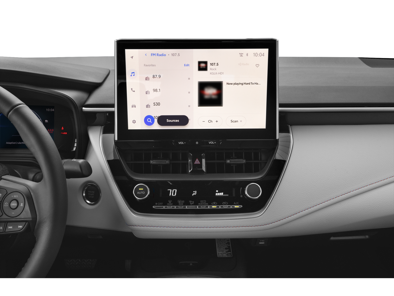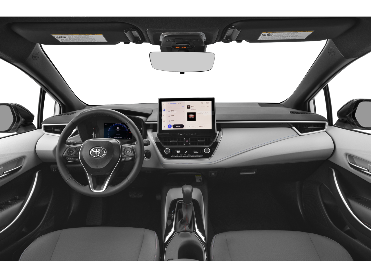 This vehicle comes equipped with: 4-Wheel Disc Brakes, 6 Speakers, ABS brakes, Air Conditioning, Alloy wheels, AM/FM radio: SiriusXM, Apple CarPlay/Android Auto, Auto High-beam Headlights, Automatic temperature control, Brake assist, Bumpers: body-color, Delay-off headlights, Driver door bin, Driver vanity mirror, Dual front impact airbags, Dual front side impact airbags, Electronic Stability Control, Emergency communication system: Safety Connect (up to 10-year trial subscription), Exterior Parking Camera Rear, Fabric Seat Trim, Four wheel independent suspension, Front anti-roll bar, Front Bucket Seats, Front Center Armrest, Front reading lights, Front Sport Seats, Fully automatic headlights, Heated door mirrors, Illuminated entry, Knee airbag, Leather steering wheel, Low tire pressure warning, Navigation system: Drive Connect Cloud Navigation (1-year trial subscription), Occupant sensing airbag, Outside temperature display, Overhead airbag, Panic alarm, Passenger door bin, Passenger vanity mirror, Power door mirrors, Power steering, Power windows, Radio data system, Radio: 10.5 Toyota Audio Multimedia, Rear anti-roll bar, Rear seat center armrest, Rear side impact airbag, Rear window defroster, Remote keyless entry, Speed control, Split folding rear seat, Spoiler, Steering wheel mounted audio controls, Tachometer, Telescoping steering wheel, Tilt steering wheel, Traction control, Trip computer, Turn signal indicator mirrors, Variably intermittent wipers, and Wheels: 18 Satin-Black Finished Alloy.